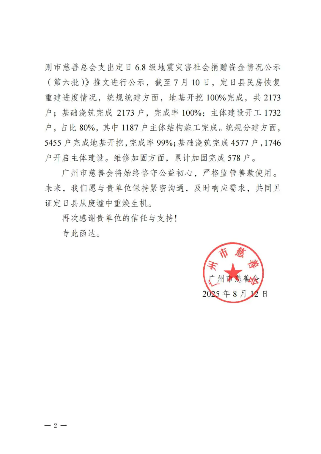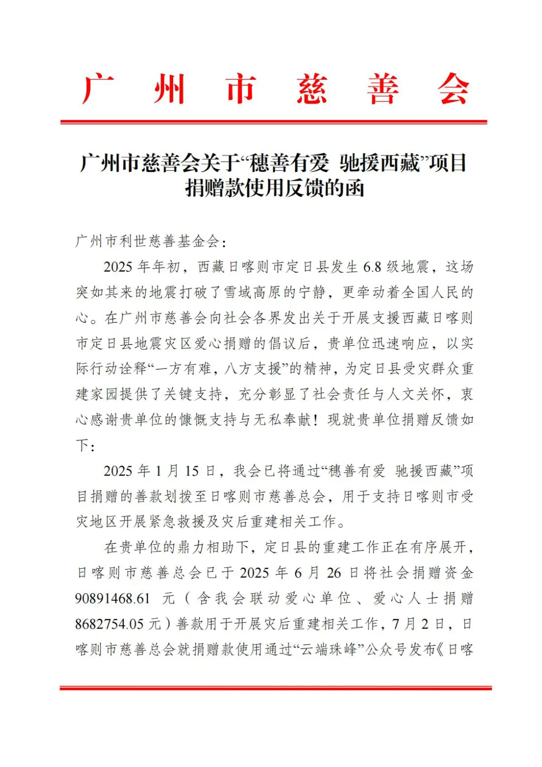 近日,广州市慈善会向利世慈善发来《广州市慈善会关于“穗善有爱 驰援西藏”项目捐赠款使用反馈的函》,清晰地反馈了地震捐赠款项的实际使用情况(详见后文)。