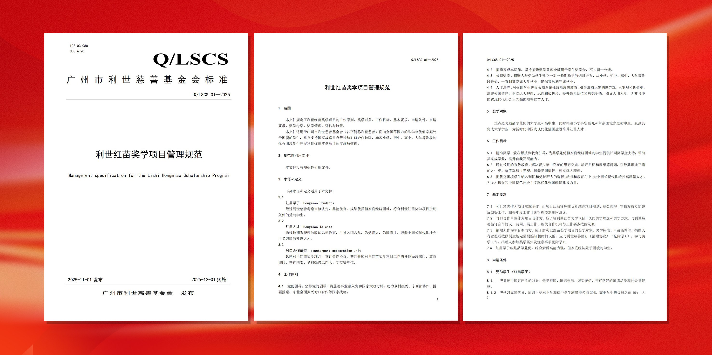 广州市利世慈善基金会首部关于慈善奖学项目的标准化管理规范——《QLSCS 01—2025 利世红苗奖学项目管理规范》经2025年6月28日第三届理事会第一次会议审议通过,2025年11月1日正式发布,12月1日...
