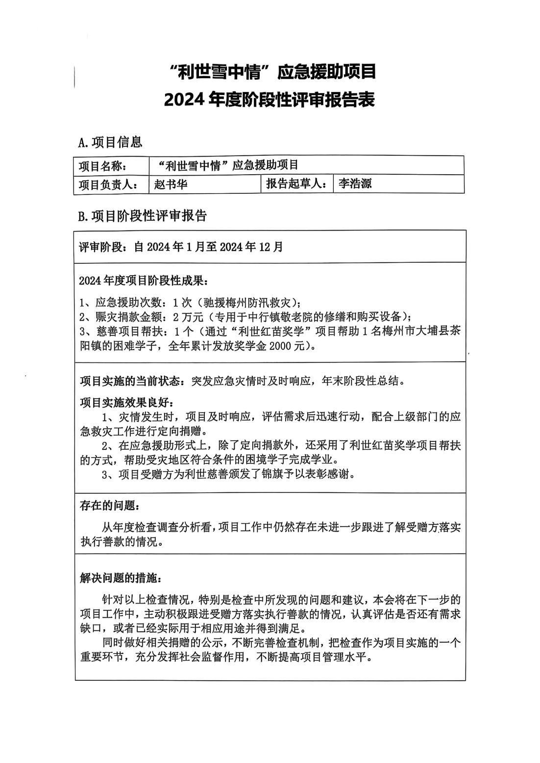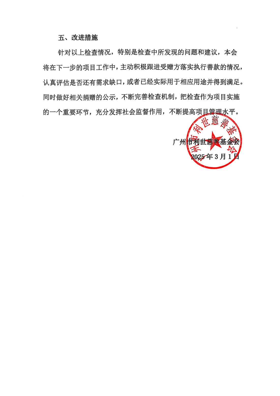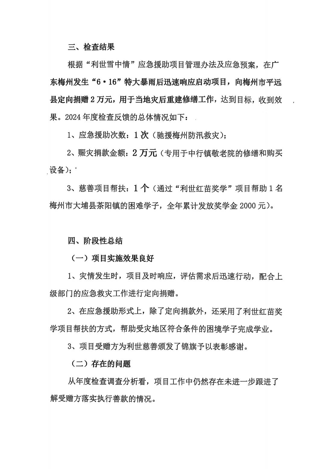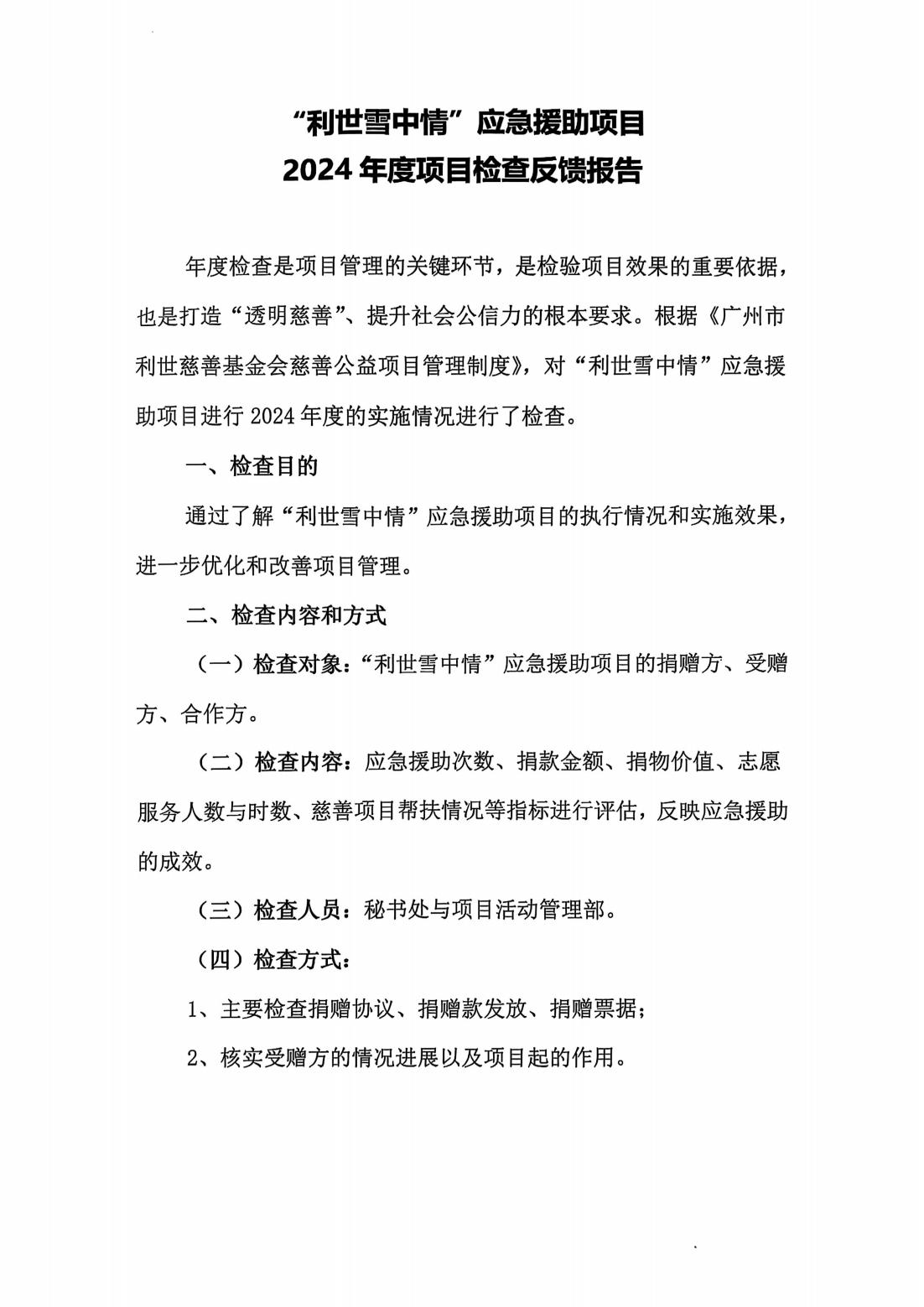 年度阶段性检查是项目管理的关键环节,是检验项目效果的重要依据也是打造“透明慈善”、提升社会公信力的根本要求。根据《广州市利世慈善基金会慈善公益项目管理制度》,对“利世雪中情”应急援助项目 2024 年度的实施情况进行了阶段性检查总结。