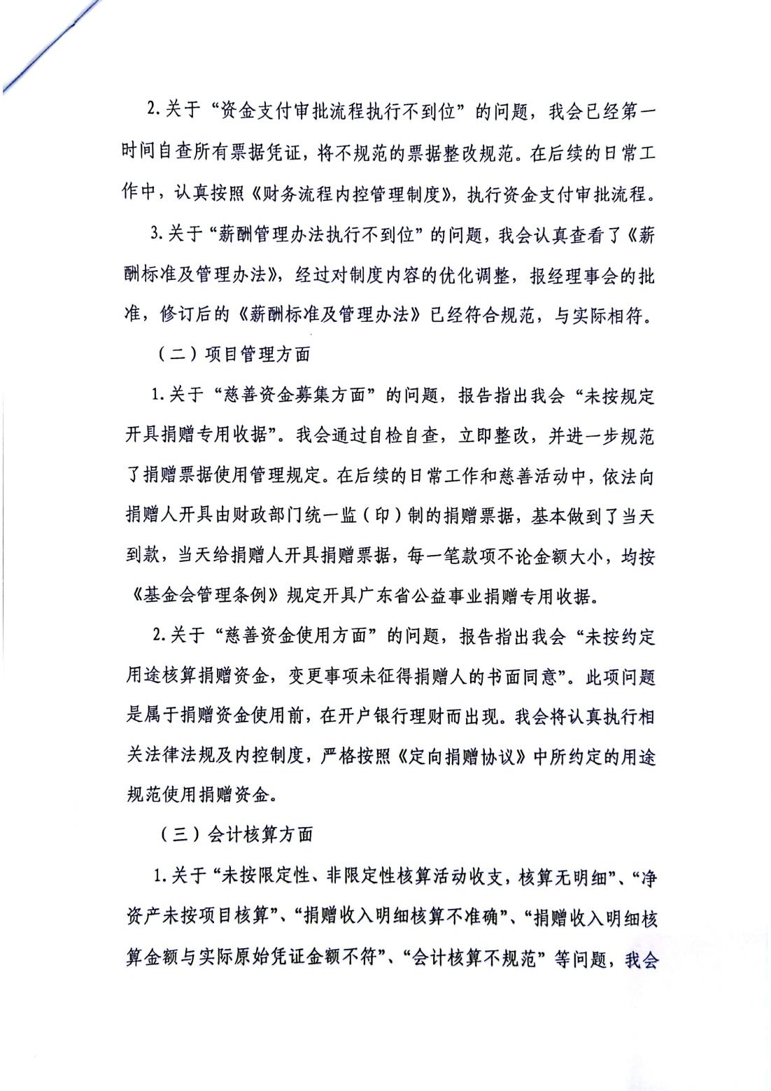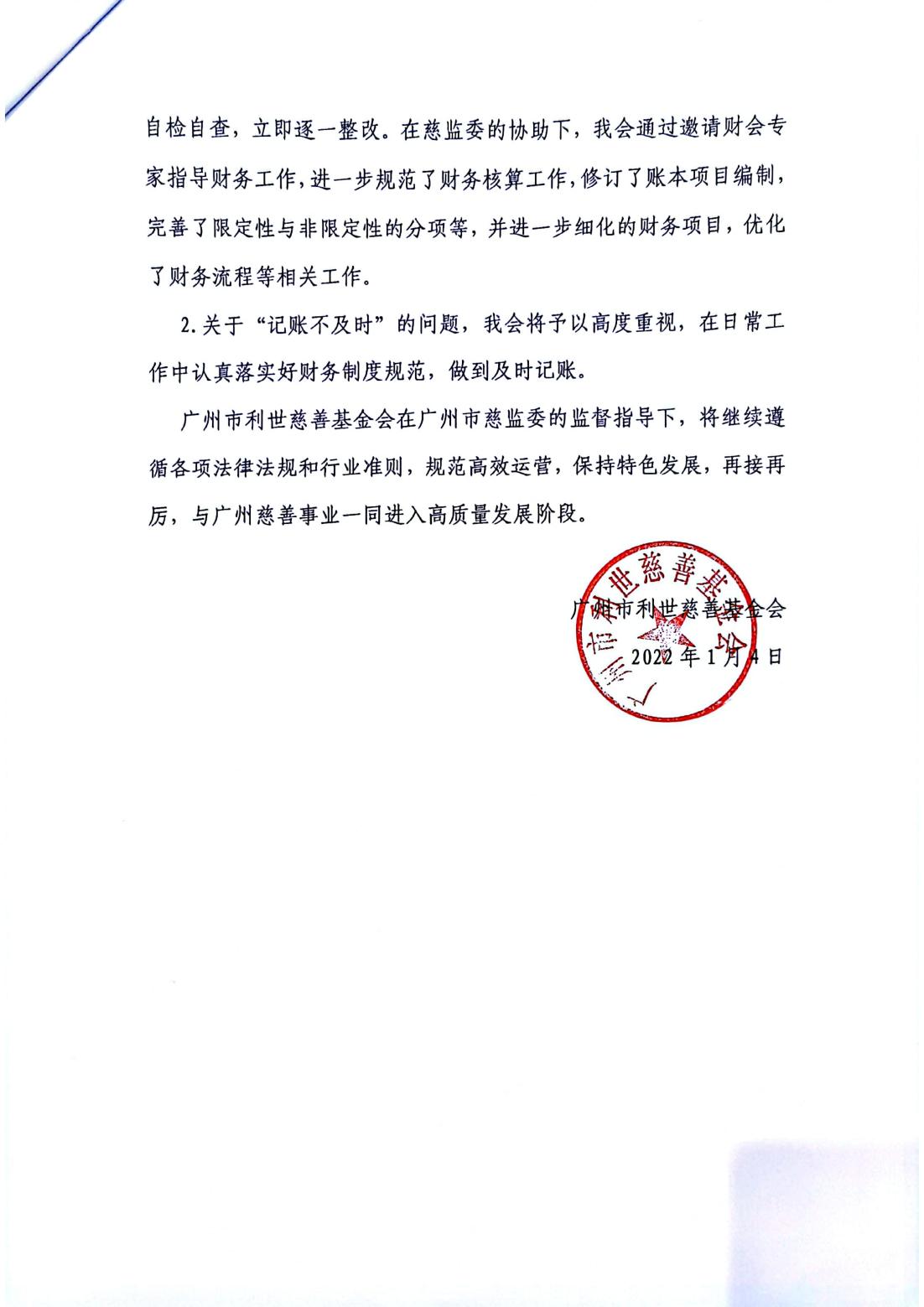 根据2021年7月15日至2021年10月30日期间广州市民政局、广州市慈监委对广州市利世慈善基金会开展的行政检查及专项审计结果,2021年12月16日广州市民政局向广州市利世慈善基金会下发了《广州市民政局检查结果通知书》。根据检查结果的相关要求,广州市利世慈善基金会进行逐一整改,形成了改正报告,现公示如下(附件)。