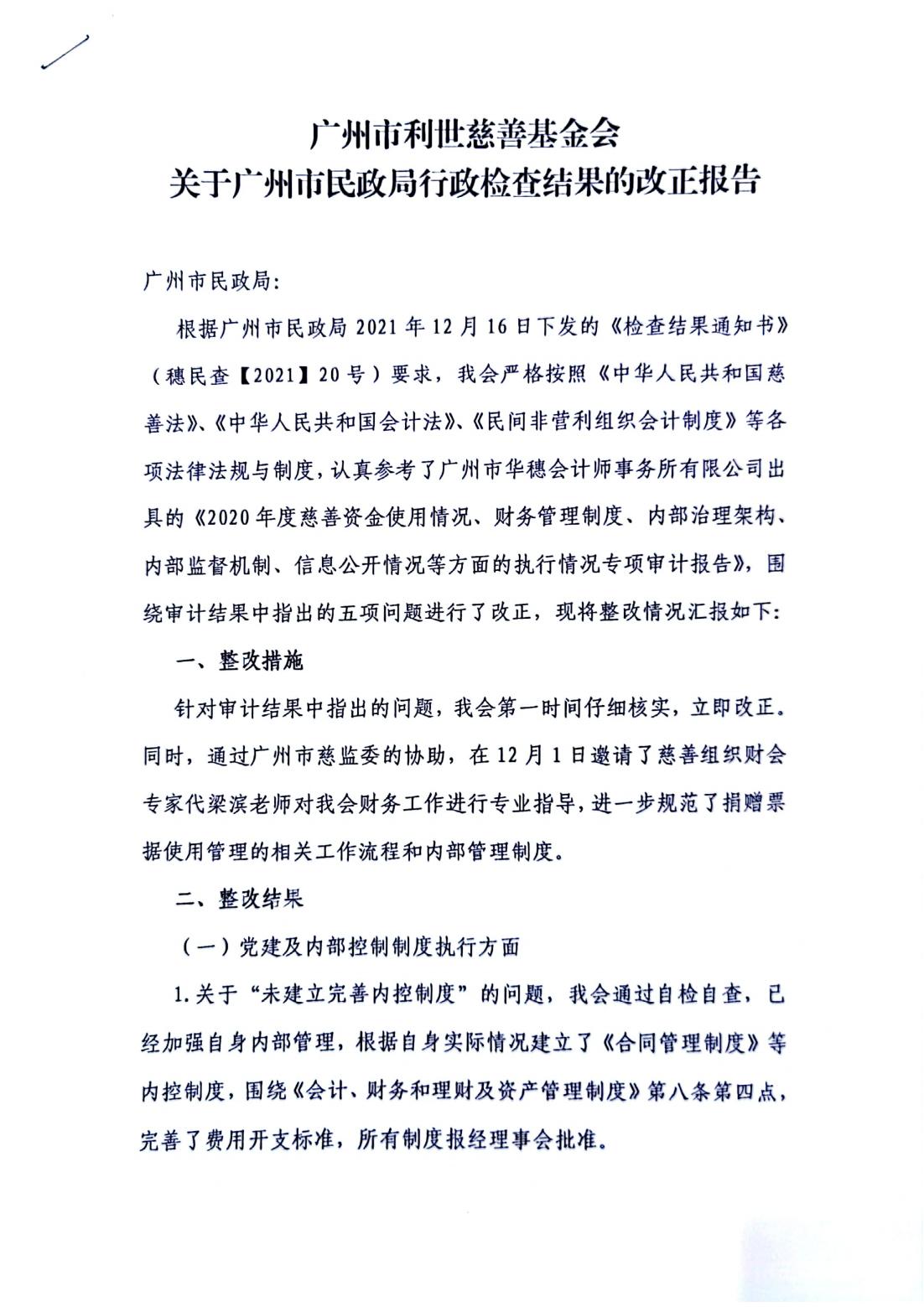 附:《广州市民政局检查结果通知书》、《广州市利世慈善基金会关于广州市民政局行政检查结果的改正报告》