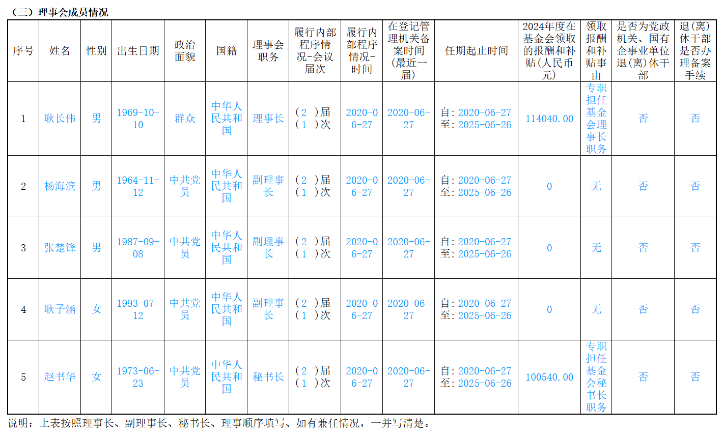 1、耿长伟,专职担任理事长(兼法定代表人)职务,2024年度在基金会领取薪酬共计114040元;
