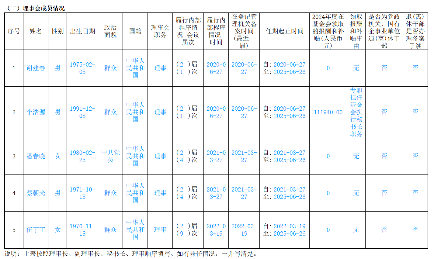 3、李浩源,专职担任理事兼执行秘书长职务,2024年度在基金会领取薪酬共计111940元。